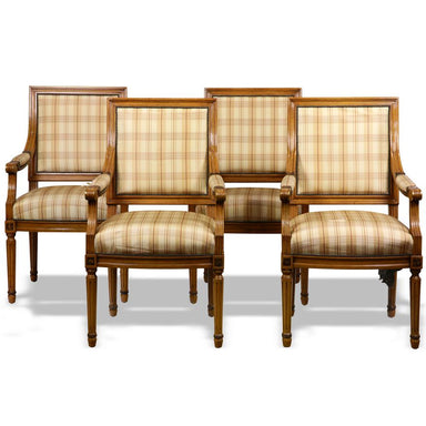 Set of 4 Louis XVI style fauteuils, each with brass nail head trim, and rising on fluted legs, 38"h x 22"w