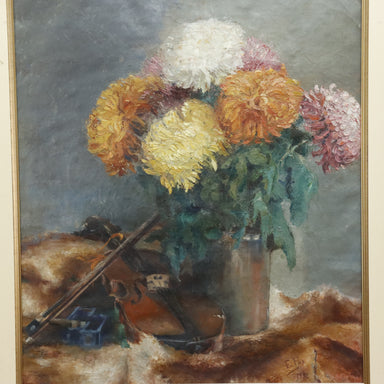 E. Pas Floral Still Life With Violin Oil on Canvas. Signed E. Pas and dated 1935 lower right. Dimensions: Sight 28 x 24 1/2"; Frame 35 3/4" x 31 3/...