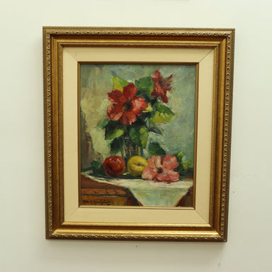 Antonis Karafyllakis - Post Impressionist Still Life with Flowers & Apples - Oil on Masonite Panel. Signed & dated lower left " 1960 A. Kar...