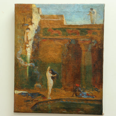 Pair of Late 19th Century Syrian ebonized wood and mother-of-pearl inlaid chairs, each with back having spindle turned reticulated panels, above a ...