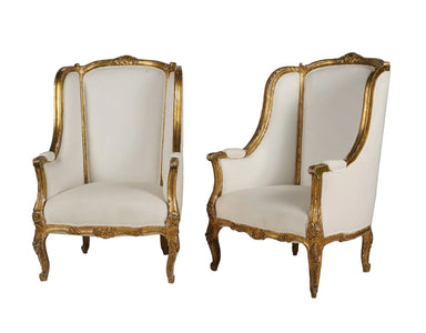 Mid 19th Century French Louis XV Carved Giltwood High Back Bergeres, covered in white fabric 45" x 28" x 27" (114.3 x 71.1 x 68.6 cm.), Seat height...
